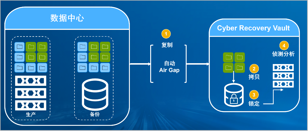 豪门国际防勒索病毒方案将生产中心备份数据复制到Vault区,复制后网络自动断开实现弹性隔离。Vault区的数据快速拷贝,并对拷贝版本加锁(在锁定期数据不允许删除和修改)。Vault沙箱内对拷贝版本进行扫描分析,验证数据是否完好。